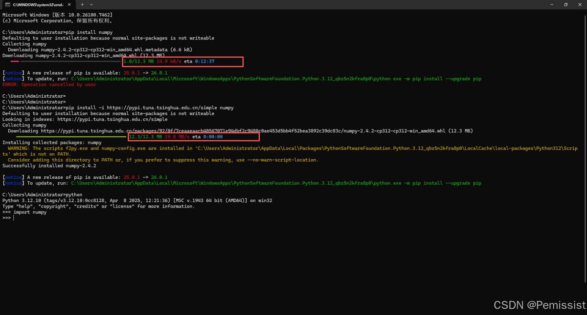 # 默认从国外网站下载,速度较慢 pip install 包名称 # 通过使用国内网站下载速度较快:https://pypi.tuna.tsinghua.edu.cn/simple pip install -i https://pypi.tuna.tsinghua.edu.cn/simple 包名称