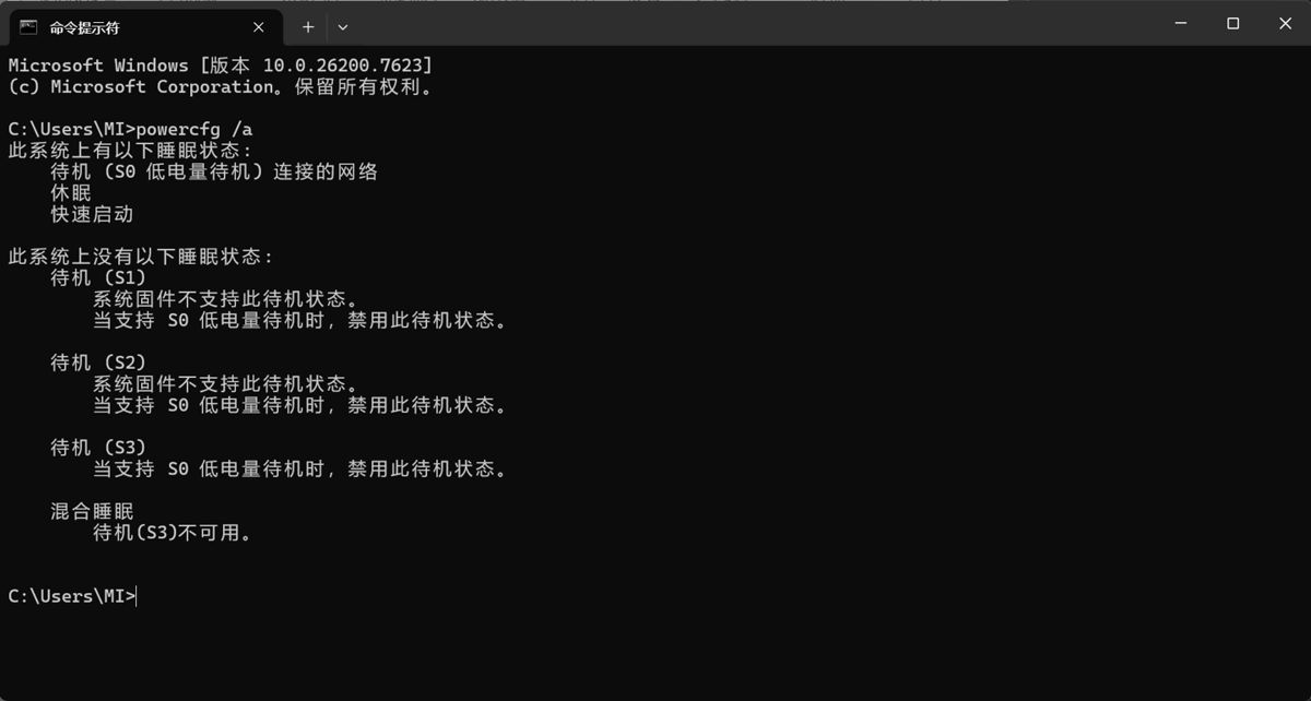 若要查看你的电脑支持哪些睡眠状态,需打开命令提示符并运行以下命令:powercfg /a