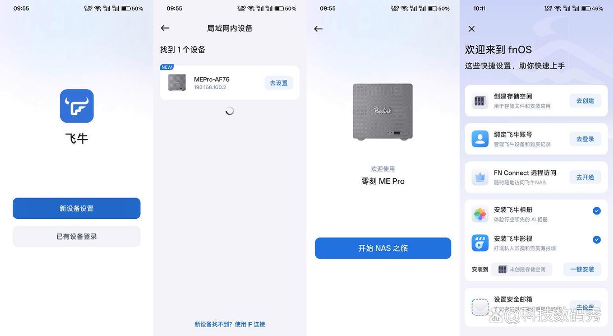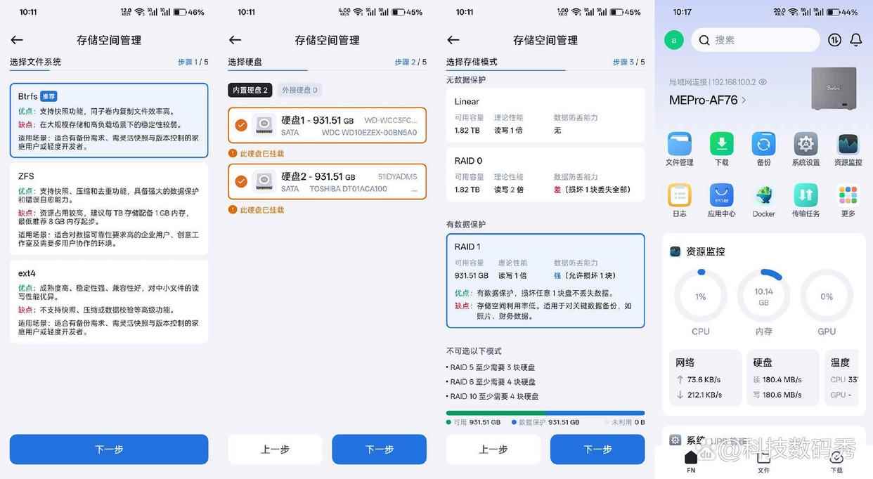 扫描说明书上的二维码,或者直接在应用商店下载“飞牛”app,当手机和零刻me pro处于同一网络下时,app会自动找到设备并进行存储空间的创建和账号绑定,创建存储空间的方式看个人习惯,系统提供了3种文件系统的选择,并且对于双盘位可以软件组raid 0或者raid 1,主要看你对于数据存储的重要性,像平时如果只是用来做电影海报墙娱乐观影使用的话,raid 0就ok,如果你是用来存储工作资料或者个人重要相册文件,那就组raid 1有数据保护,两块硬盘损坏其中任意一块都不会丢失数据。