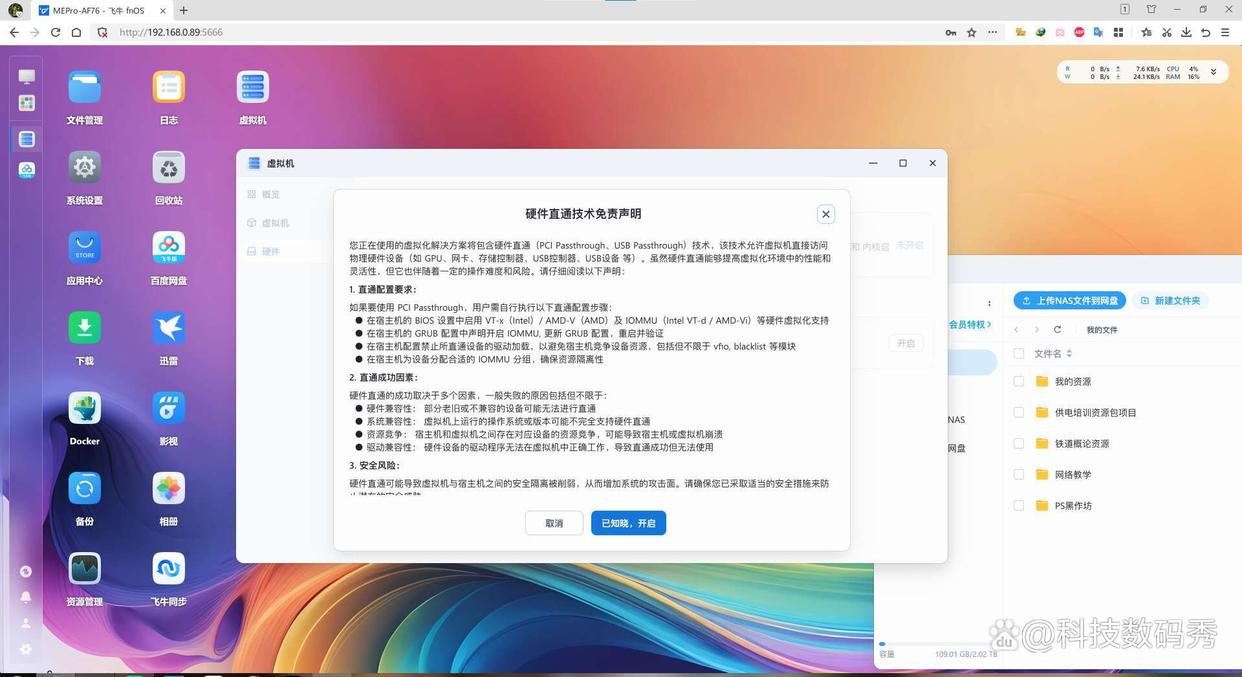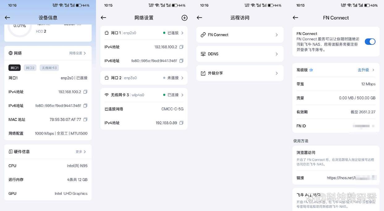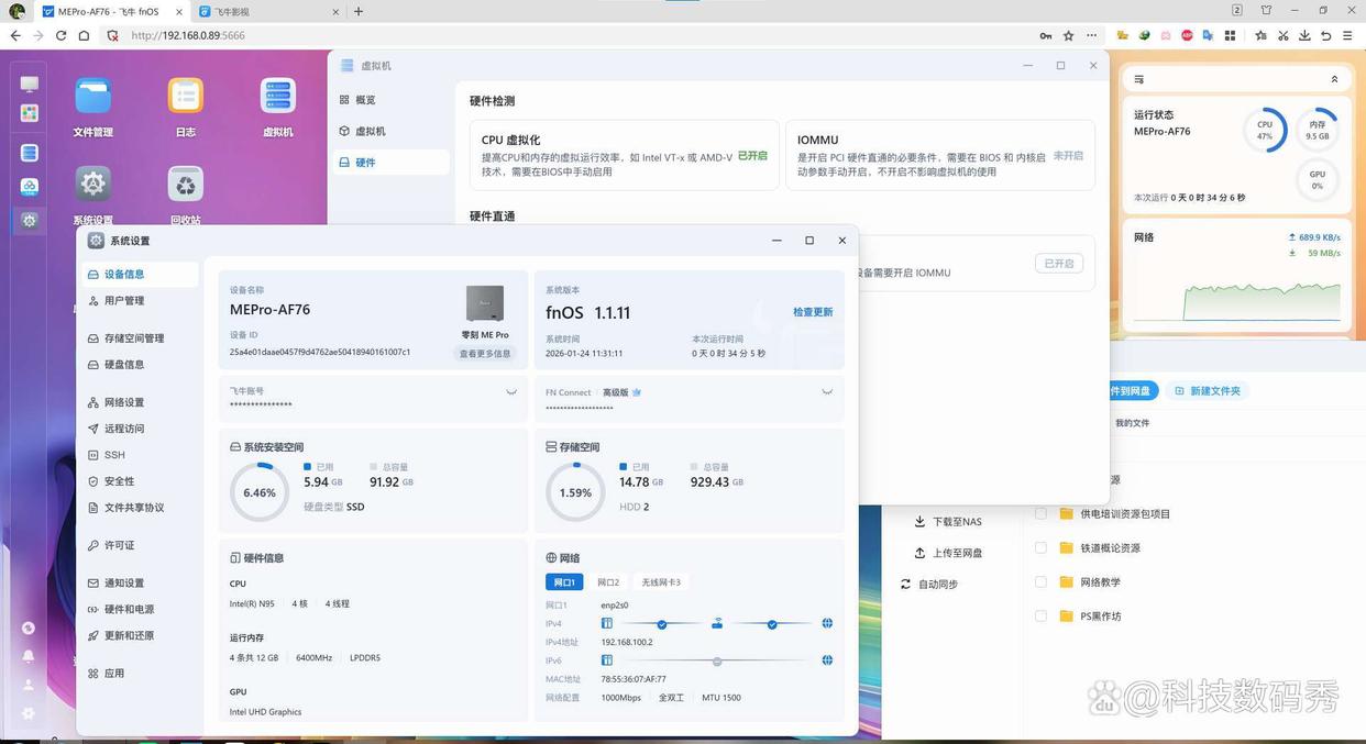 由于手机端我们已经开通了fn connect远程访问,所以你无需查看零刻me pro的ip地址,直接输入fnos.net/你的id 即可,主界面系统设置里也能很方便的看到主机当前运行状态,存储空间使用情况、硬件信息、网络信息、硬盘温度风扇转速等等。