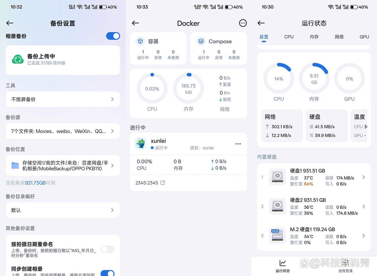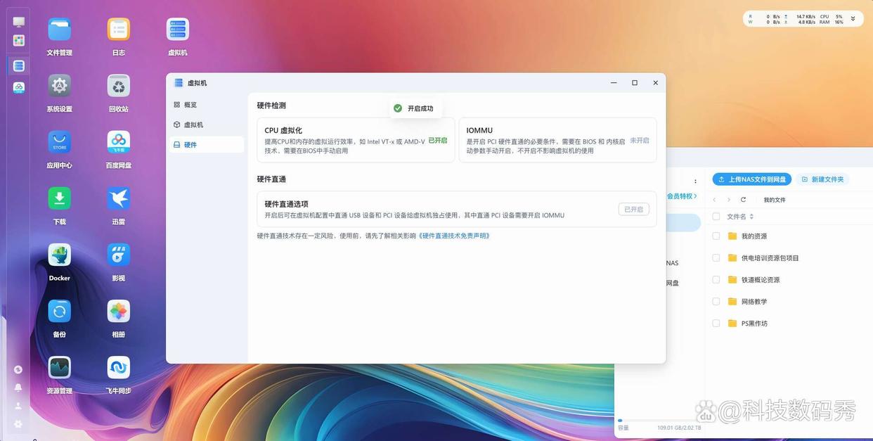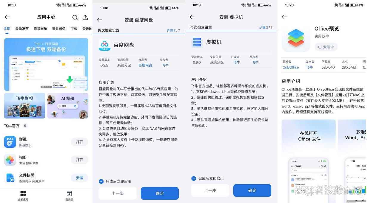 在应用中心里,可以直接安装的官方应用有9个,分别是影视、相册、文件快照、虚拟机、iscsi、office预览、百度网盘、飞牛同步、文本编辑器。如果你想下载更多的社区应用,那就点击主界面的docker创建容器,然后像各种音乐软件、迅雷、磁力下载软件、花生壳、ftp等等就可以随心下载了。