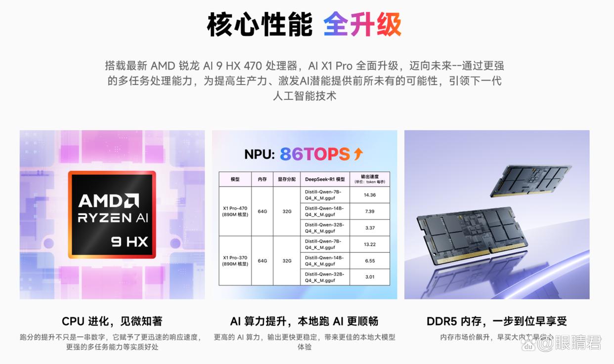 新一代x1 pro最大的升级还是源于amd新一代ryzen ai 9 hx470处理器,cpu、gpu、npu性能全面提升,综合ai算力提升至86tops,满足当下全面爆发的本地ai应用性能需求。