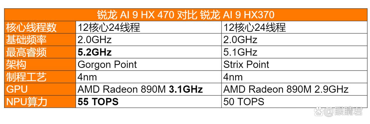 具体对比上一代采用的amd ryzen ai 9 hx370,npu算力从50 tops提升到55tops,同时cpu频率提升0.1ghz,gpu频率提升0.2ghz,整体性能更上一个台阶。