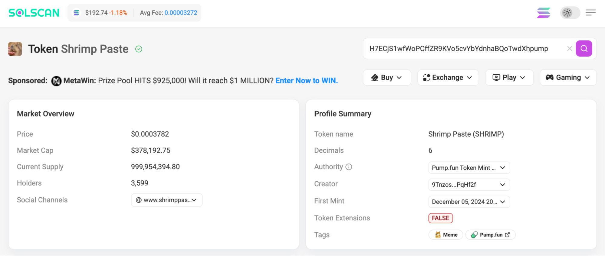 截稿前根据 solscan 数据显示 shrimp holders 人数为 3,599,相对较少需要留意交易风险。