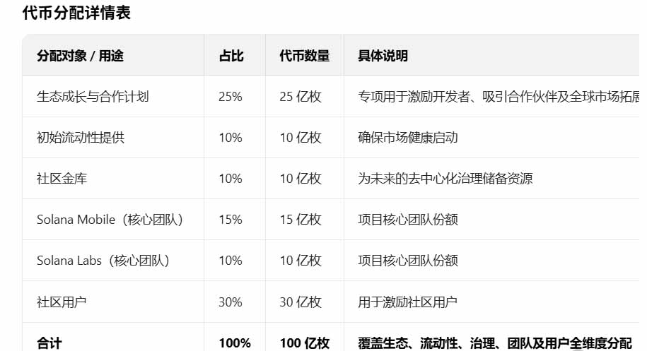 项目核心团队(solana mobile与solana labs)将分别获得15%和10%的份额。值得注意的是,这部分代币设有12个月的悬崖锁仓期,之后在36个月内线性释放。这种设计确保了团队利益与生态的长期成功深度绑定,避免了短期套现行为。
