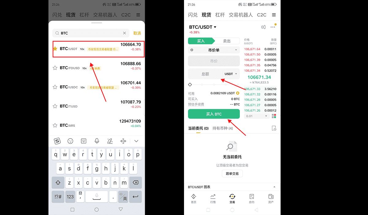 在“资产”页面检查,确保您的usdt等在 “交易账户” 中。如不在,需先通过“资金划转”从“资金账户”转入,此操作即时免费。在app底部点击 “交易”,进入现货交易区。在搜索框输入“btc/usdt”这样的交易对。
