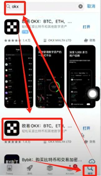 点击右下角的搜索,在搜索框输入okx。搜索结果的第二个黑底和五个白色的方格就是欧易okx的图标,直接下载就可以了。我这里是下载过了。