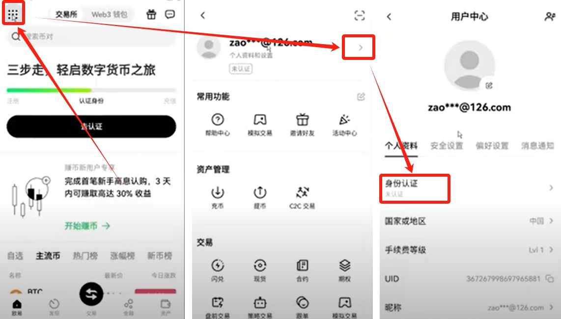 因为我们的钱都是在交易所里面,所以安全问题一定要搞好。登录一下我们的app,点击左上角的九个点,点击向右的小箭头,点击身份认证。我们按照自己的真实情况识别一下就可以了。所有的交易所必须实名认证,这个请大家放心,是没有问题的。