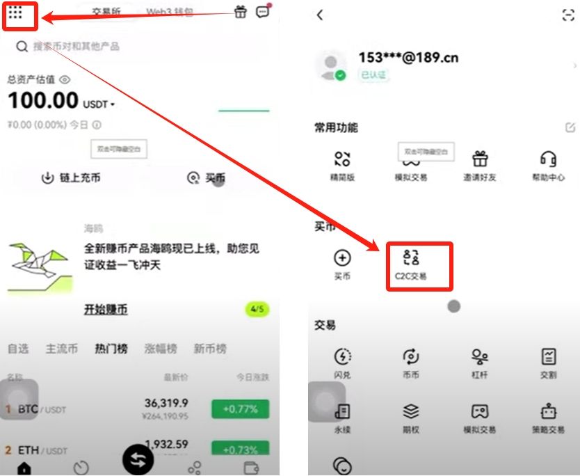 如果没有买币的按钮,我们可以点击左上角的九个点,然后选择“c2c交易”。一定不要选择旁边的买币,因为买币是系统随机分配的,很有可能遇到骗子。我们选择c2c交易,自己去筛选。