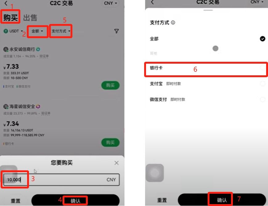 上方选择【购买】,金额比如说我输入10000,点击【确认】。支付方式我们选择银行卡,点击【确认】。