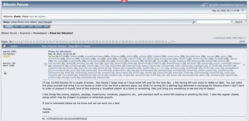 在2010年5月18日将其报价发布到bitcointalk论坛后,经历了四天才有人接受了这个交易,并在5月22日安排了比萨送货。这个日期如今已经成为加密货币社区的非正式节日,每年5月22日全球各地都举行庆祝活动、事件和特别促销。