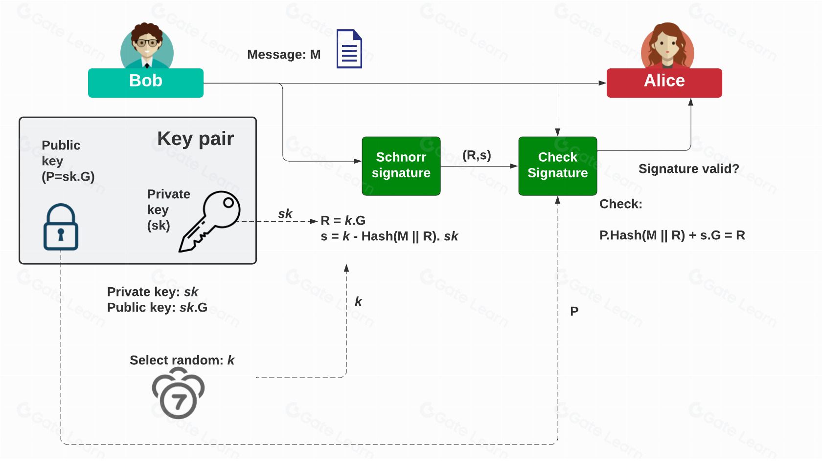 在本例中,bob 想要对消息(m)进行签名。他有一个私钥 sk,并生成了公钥 p=sk.g,其中 g 是椭圆曲线上的基点。
