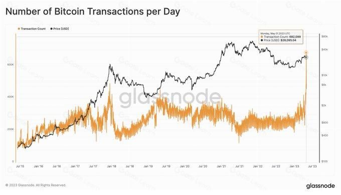 “#btc 链上交易数量最近出现了惊人的激增,日交易量突破 50 万笔,5 月 1 日创下 68.2 万笔的历史新高。”