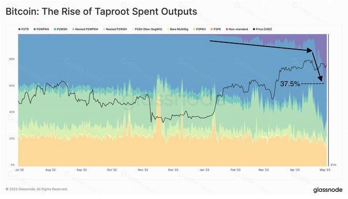 他表示,这一增长的原因还在于 taproot 交易的增加——4 月 30 日,高达 37.5% 的支出输出是 p2tr 输出类型。