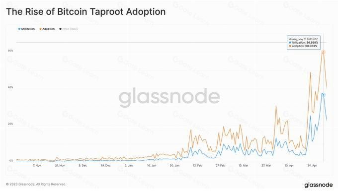 taproot 采用率和利用率指标证实了这一上升趋势的观察结果。 5月1日,60% 的比特币交易使用了taproot,创下了历史新高。