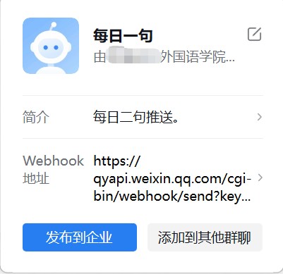 最终的推送机器人配置如下。如果想让所有学生接收信息,可以把这个机器人添加到学生企业微信群中,这样每天就可以看到发送的信息了。