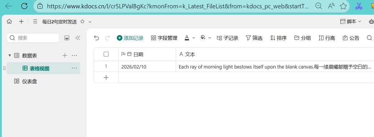 这样每天固定时间,如9:00,wps多维表就会定时增加一条记录,然后py脚本【每日2句发送】就会自动执行,爬取网上的每日英语,并写入到多维表中。