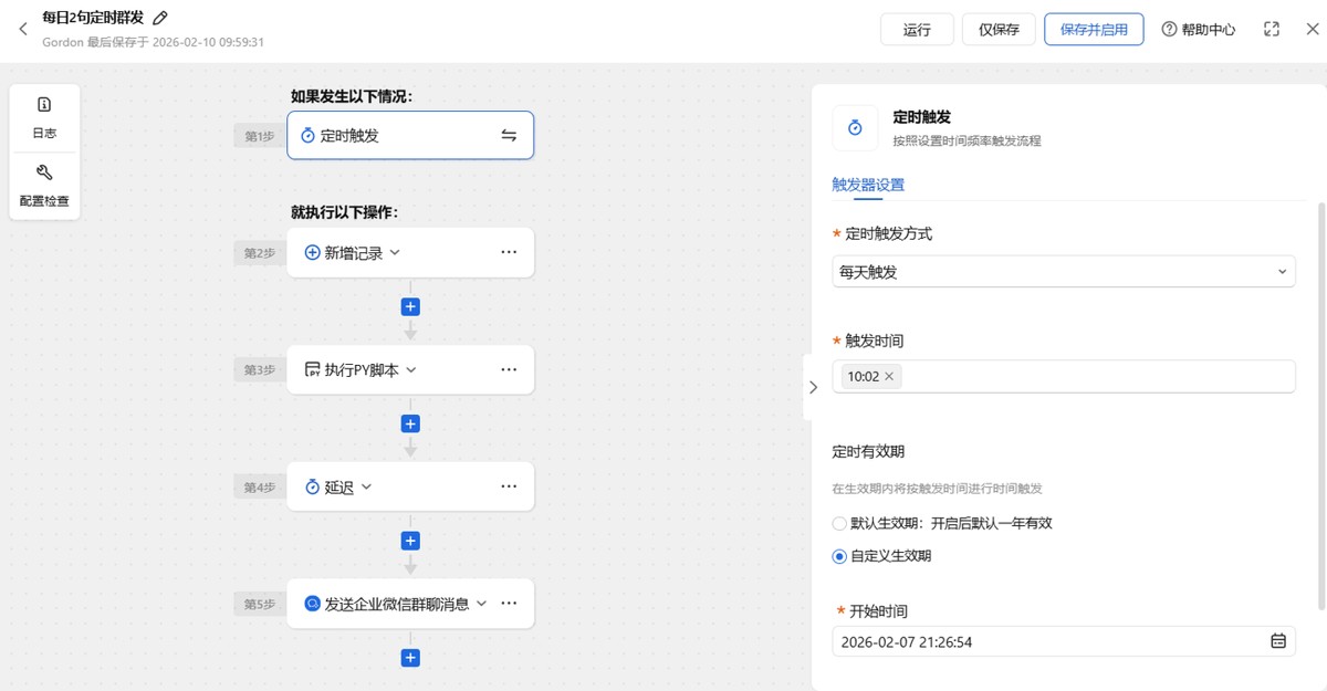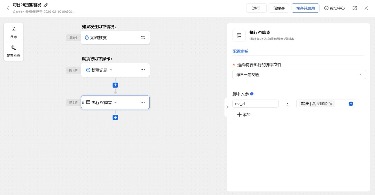 接下来,新增时间记录,执行py脚本,并传入当前新增记录id,这样代码就可以把每日英语写入到上一步的新增记录里。最后还要点击【保存并启动】,启用当前流程。