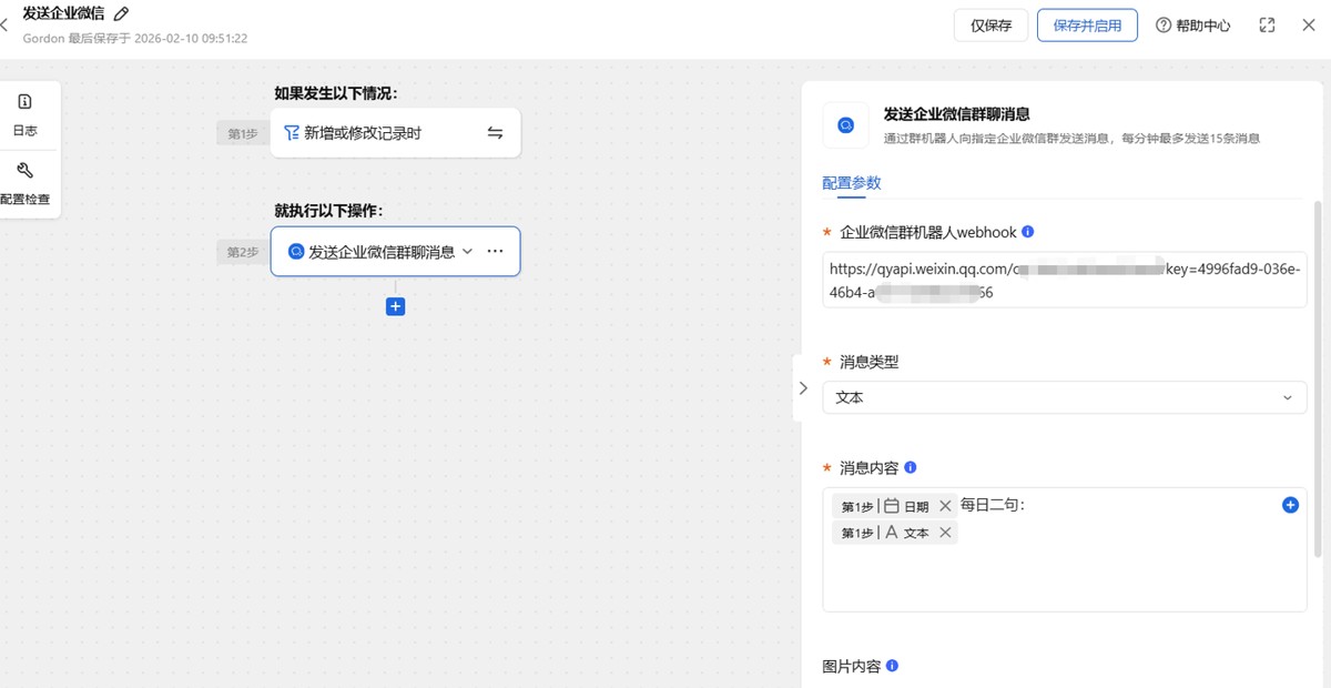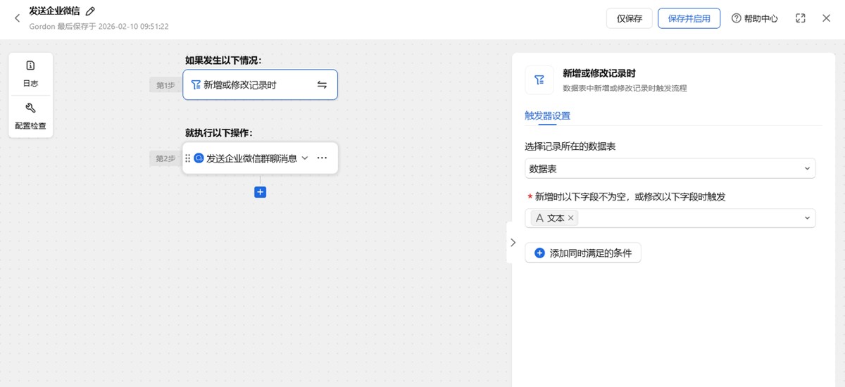 最后,再设置一个发送企业微信的自动化流程,把上一个流程中获得的每日英语发送到企业微信,触发条件为当数据表中文本字段内容不为空时。