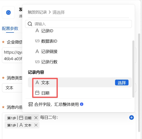 消息内容选择第1步触发的记录的日期和文本。这样就可以把【每日2句定时发送】流程中写入的日期和文本信息同步发送出去。
