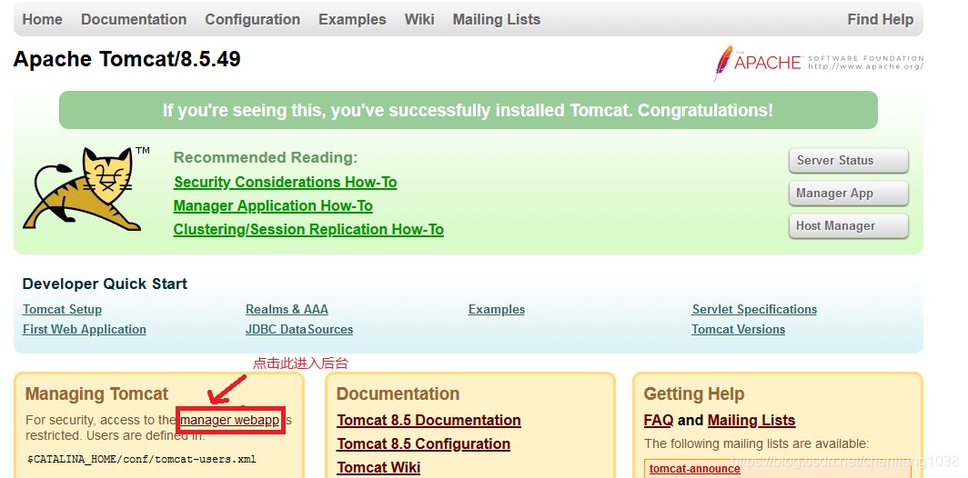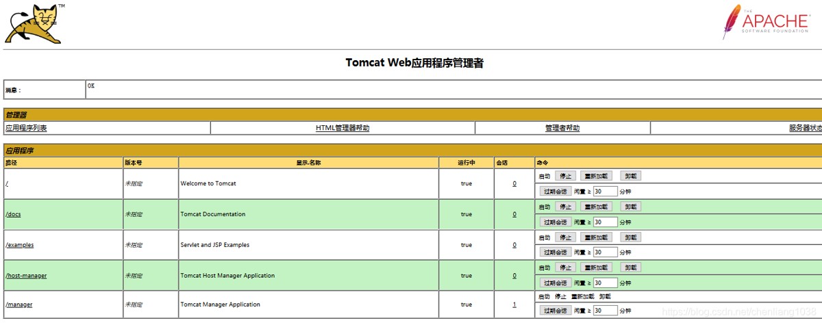 vim /usr/local/apache-tomcat/conf/tomcat-users.xml tail /usr/local/apache-tomcat/conf/tomcat-users.xml ##添加以下内容,注意一定要在</tomcat-users>以内 ##--------------------------------------------- <role rolename="admin"/> <role rolename="admin-gui"/> <role rolename="admin-script"/> <role rolename="manager"/> <role rolename="manager-gui"/> <role rolename="manager-script"/> <role rolename="manager-jmx"/> <role rolename="manager-status"/><user name="admin" password="qaz123" roles="admin,manager,admin-gui,admin-script,manager-gui,manager-script,manager-jmx,manager-status" /> #-------------------------------------------------------- ##user name="admin":管理员admin ##password="qaz123":管理员密码 ##roles:角色 </tomcat-users>