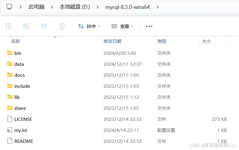 我们发现解压后的目录并没有my.ini文件,没关系可以自行创建。在安装根目录下添加 my.ini(新建文本文件,将文件类型改为.ini),写入基本配置: