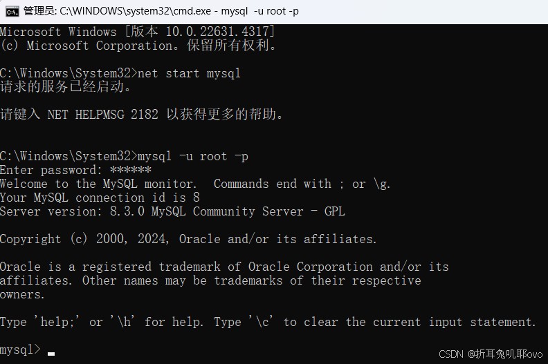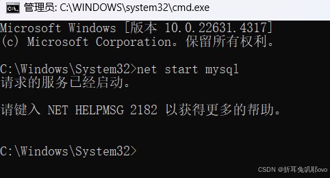 安装完成之后,就可以通过命令net start mysql启动mysql的服务了。通过命令net stop mysql停止服务。通过命令**sc delete mysql/mysqld -remove**卸载 mysql 服务