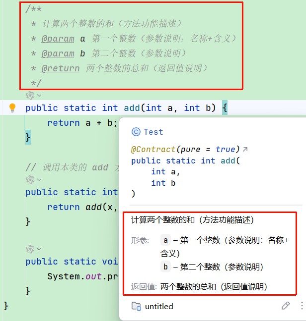 一个规范的方法需添加文档注释,便于他人理解和工具生成文档。在定义好方法后在方法的上面一行使用文档注释,一般通过输入/**敲回车,就会生成参数模板,然后填写对应的说明即可。在添加文档注释后鼠标悬停在方法名上时会显示注释内容,大大提高代码的可读性