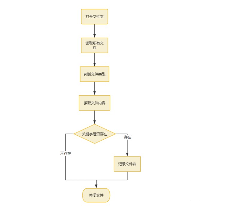 主要思路就是通过打开文件夹,获取文件,一个个遍历查找关键字,流程图如下: