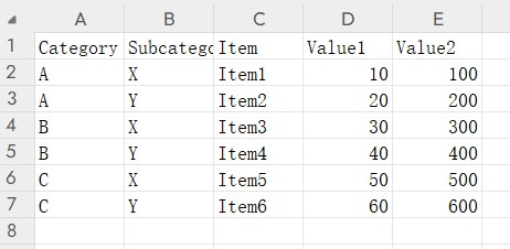 这里创建一个包含分类、子分类、项目名称以及两个值的表格。