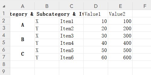 'category & subcategory & item'。 - 设置字体和对齐方式:使用