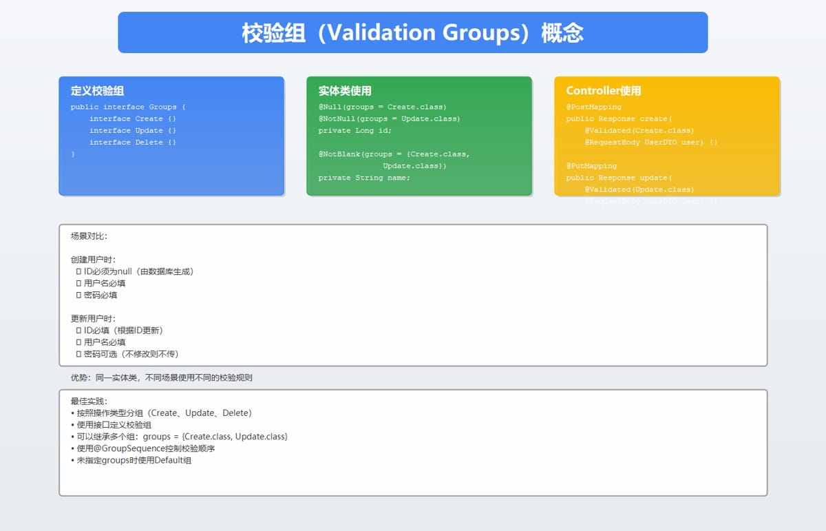 - 校验组:使用分组管理不同场景的校验规则