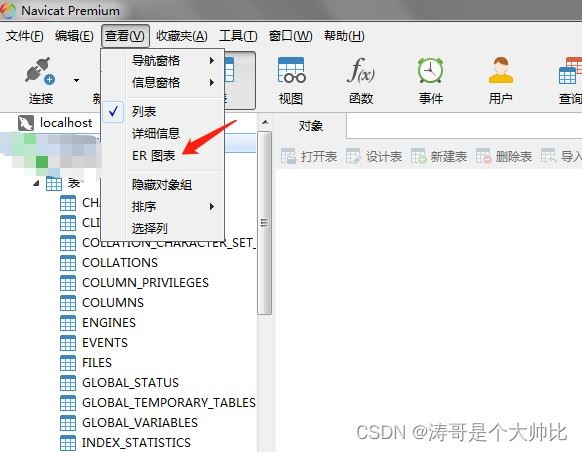 大家会发现每次添加一张表都会很慢,我们可以一次性加载所有表的er图,点击“查看”菜单,我们看到默认选中的是列表。所以我们看到的就是默认的将数据表以列表形式展现出来。