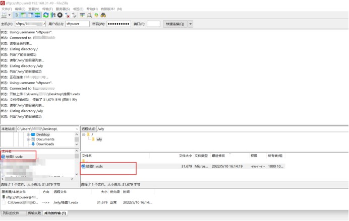 使用sftp sftpuser@192.168.31.49或使用filezilla客户端连接到sftp服务器