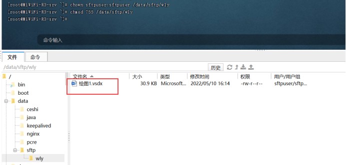 chown sftpuser:sftpuser /data/sftp/wly 将目录给用户 chmod 755 /data/sftp/wly #权限也只能是755,否则无法限制目录