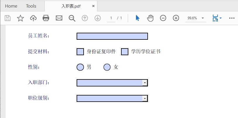 下面的示例代码以该入职表为例,分别对文本框、复选框、单选按钮和组合框等字段进行填充,并最终生成一份已填写完成的 pdf 入职表。