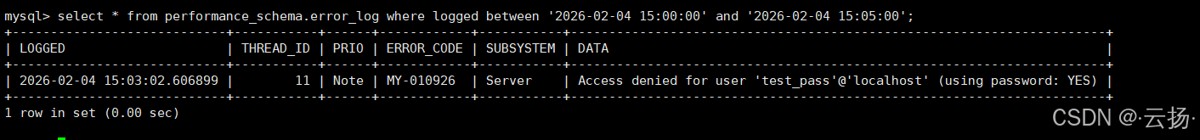 -- 查看最新10条错误日志 select * from performance_schema.error_log order by logged desc limit 10; -- 查看所有error级别的日志(格式化输出) select * from performance_schema.error_log where prio = 'error'\g; -- 查询指定时间范围的日志 select * from performance_schema.error_log where logged between '2026-02-04 15:00:00' and '2026-02-04 15:05:00';