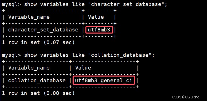 show variables like 'character_set_database'; show variables like 'collation_database';