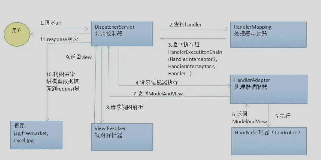 1.用户发送请求至前端控制器 dispatcherservlet
