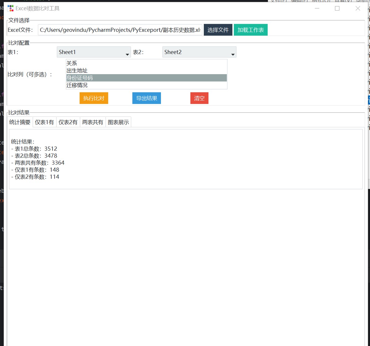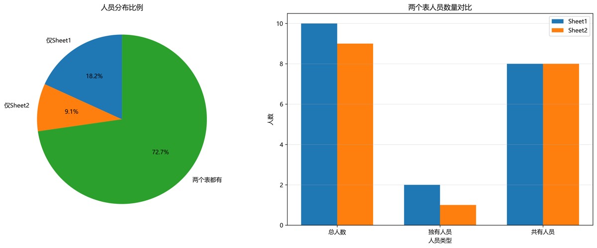 def compare_two_sheets(excel_path: str,sheet1_name: str = 'sheet1',sheet2_name: str = 'sheet2', key_column: str = '员工号', output_excel: str = '人员比对详细报告.xlsx', output_image: str = '人员比对结果图表.png') -> dict: