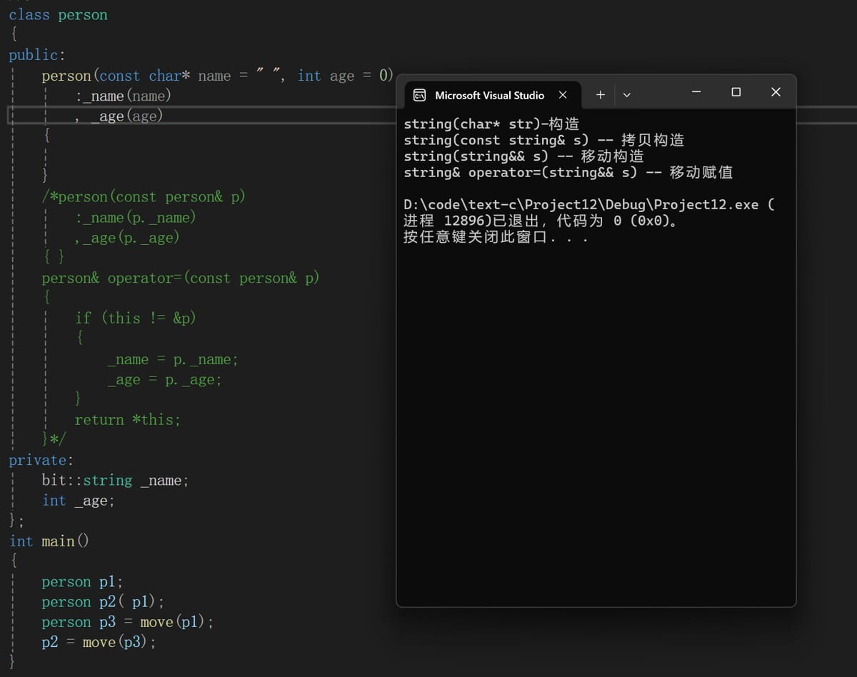 • 如果你没有⾃⼰实现移动构造函数,且没有实现析构函数、拷⻉构造、拷⻉赋值重载中的任意⼀ 个。那么编译器会⾃动⽣成⼀个默认移动构造。默认⽣成的移动构造函数,对于内置类型成员会执 ⾏逐成员按字节拷⻉,⾃定义类型成员,则需要看这个成员是否实现移动构造,如果实现了就调⽤ 移动构造,没有实现就调⽤拷⻉构造。