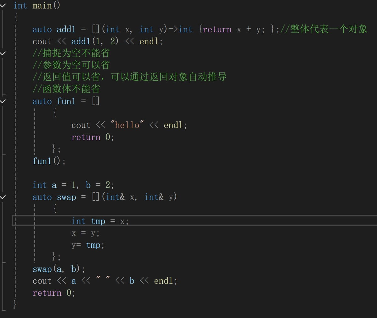 • lambda 表达式本质是⼀个匿名函数对象,跟普通函数不同的是他可以定义在函数内部。 lambda 表达式语法使⽤层⽽⾔没有类型,所以我们⼀般是⽤auto或者模板参数定义的对象去接 收 lambda 对象。