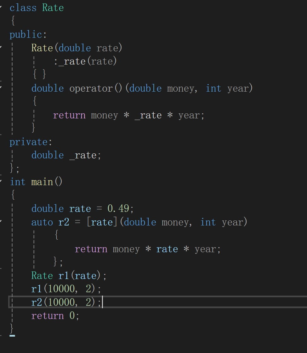 • 第⼆种捕捉⽅式是在捕捉列表中隐式捕捉,我们在捕捉列表写⼀个=表⽰隐式值捕捉,在捕捉列表写⼀个&表⽰隐式引⽤捕捉,这样我们 lambda 表达式中⽤了那些变量,编译器就会⾃动捕捉那些变量。