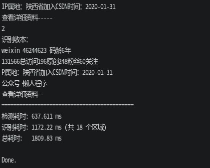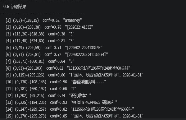 pp-ocrv5 c++ 推理 demo paddle: version: 3.0.0 图片: test.png (661x316) 字典: 18384 字符 [1/2] 文本检测... 检测到 18 个文本区域 (耗时: 665 ms) [2/2] 文本识别... [1] (0,93)-(289,103) conf=0.82 "131566总访问196原创248粉丝60关注" [2] (0,115)-(295,126) conf=0.86 "ip属地:陕西省加入csdn时间:2020-01-31" [3] (0,136)-(108,148) conf=0.96 "查看详细资料" [4] (0,225)-(184,235) conf=0.93 "weixin_46244623 码龄6年" [5] (458,282)-(660,295) conf=0.99 "公众号·懒人程序" 检测耗时: 665 ms 识别耗时: 1453 ms (共 18 个区域) 总耗时: 2118 ms