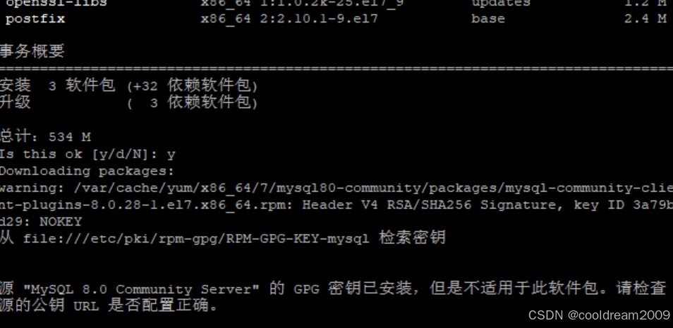 mysql 官方在 2022 年更新了 rpm 仓库签名密钥。如果系统仍使用旧版本密钥,那么新包的签名自然无法通过验证,安装会被安全机制拦截。