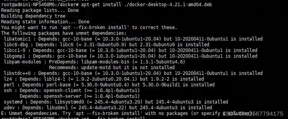 执行apt-get install (docker离线包名称)./docker-desktop-4.21.1-amd64.deb 后会报错,提示依赖错误,输入apt --fix-broken install修复依赖