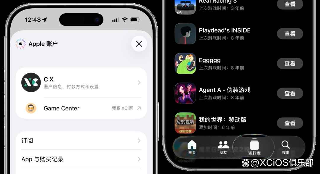 此外,一些自带的应用也调整了一些界面,例如自带的苹果游戏中心,底部的导航栏变成了液态玻璃的整条显示,而不是和之前一样独立搜索按钮。
