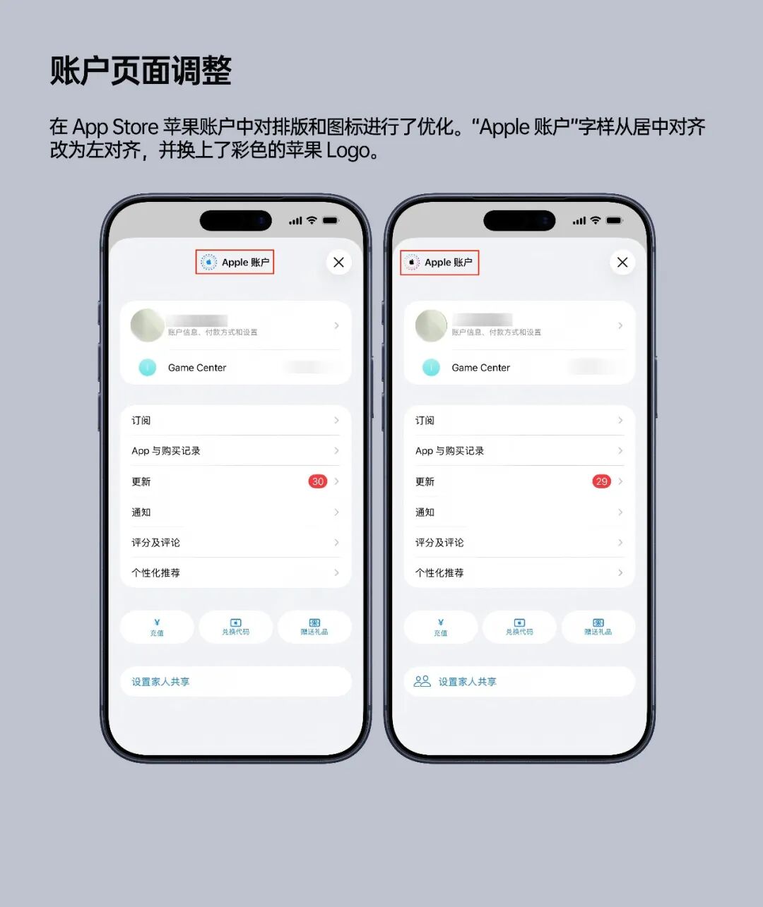 现在进入苹果音乐、app store、播客之类的应用中,在个人中心可以看到顶部的「apple账户」移到了左边,苹果图标也变成了彩虹色。