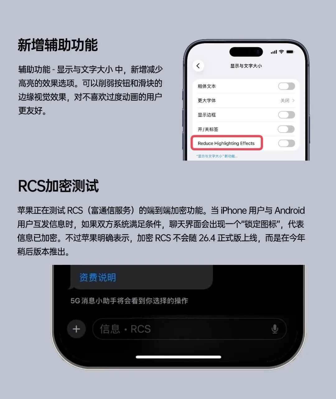 现在进入设置 - 辅助功能 - 显示与文本大小页面中,可以看到多了一个「reduce highlighting effects」的功能开关。