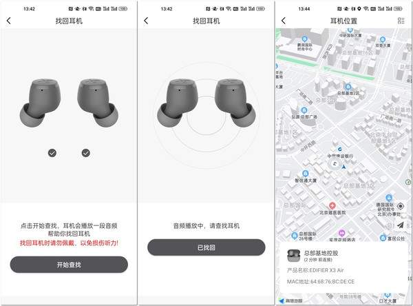 值得一提的是,这款耳机还具备找回耳机和耳机定位的功能。点击"找回耳机",耳机会发出"嘀嘀嘀"的声音,方便寻找。若不慎丢失,还可以通过"耳机定位"功能进行查找。